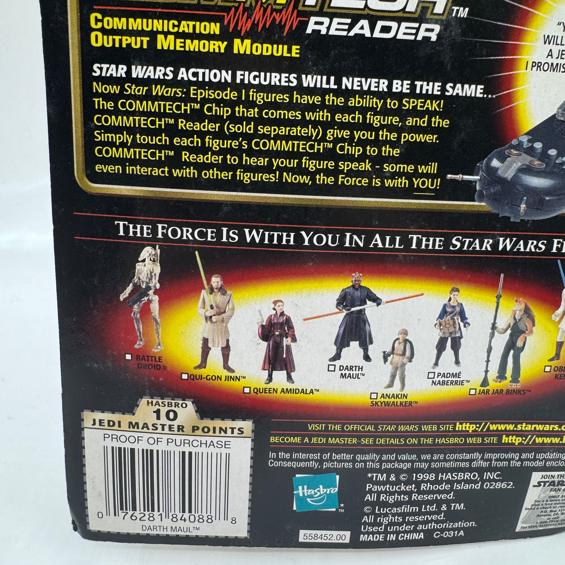 The articulated figure includes his signature double-bladed lightsaber and a CommTech chip, adding interactive appeal for collectors with a CommTech Reader (sold separately).